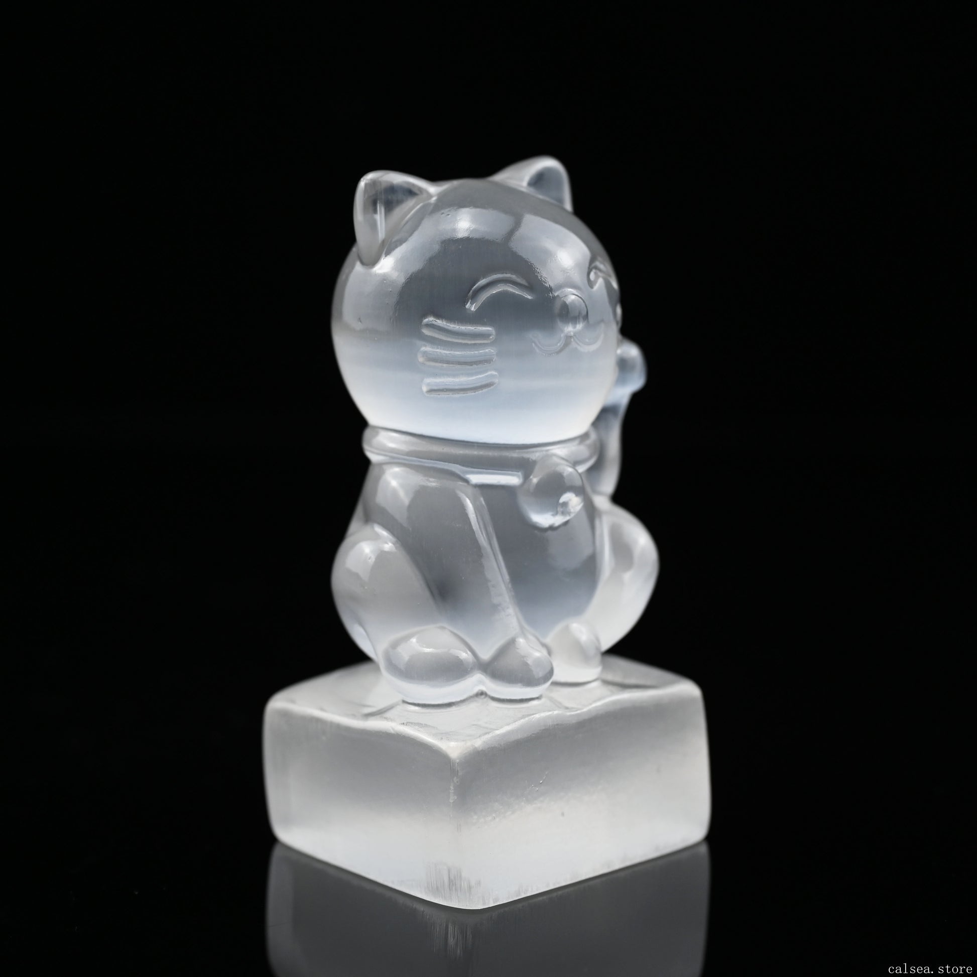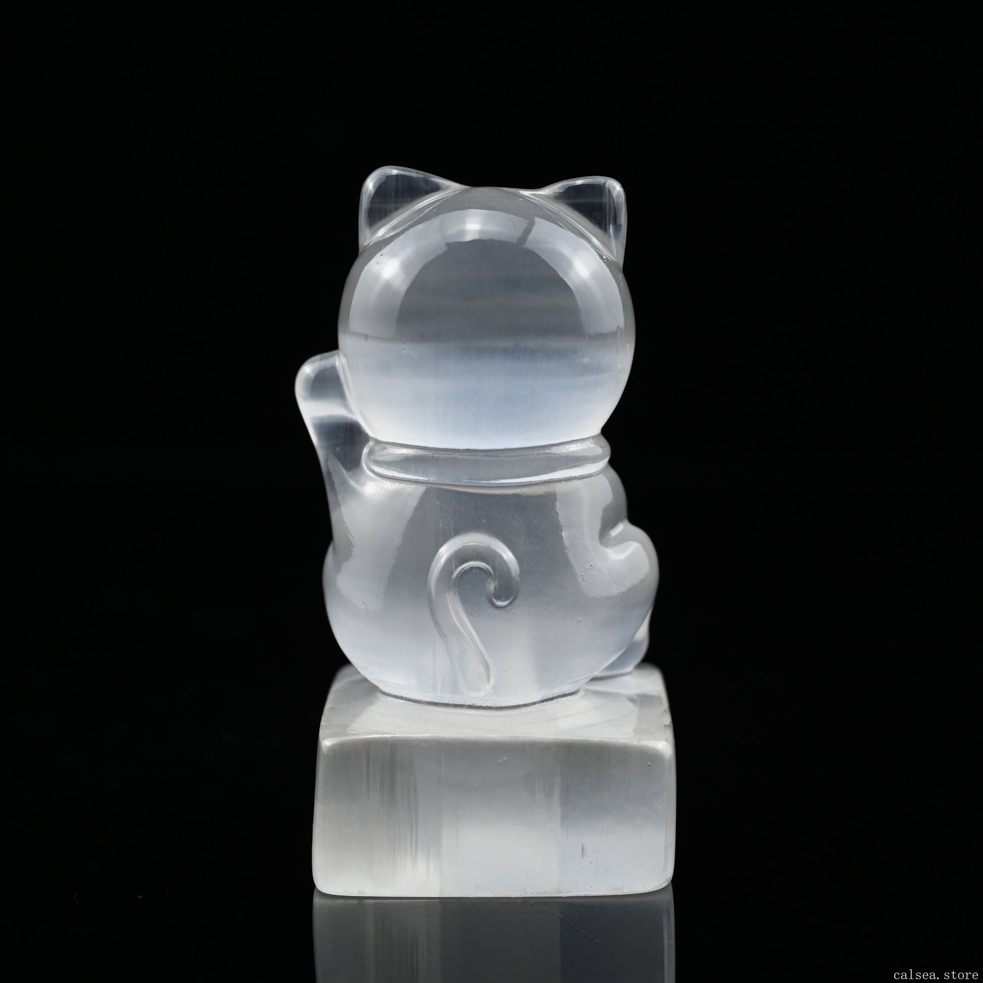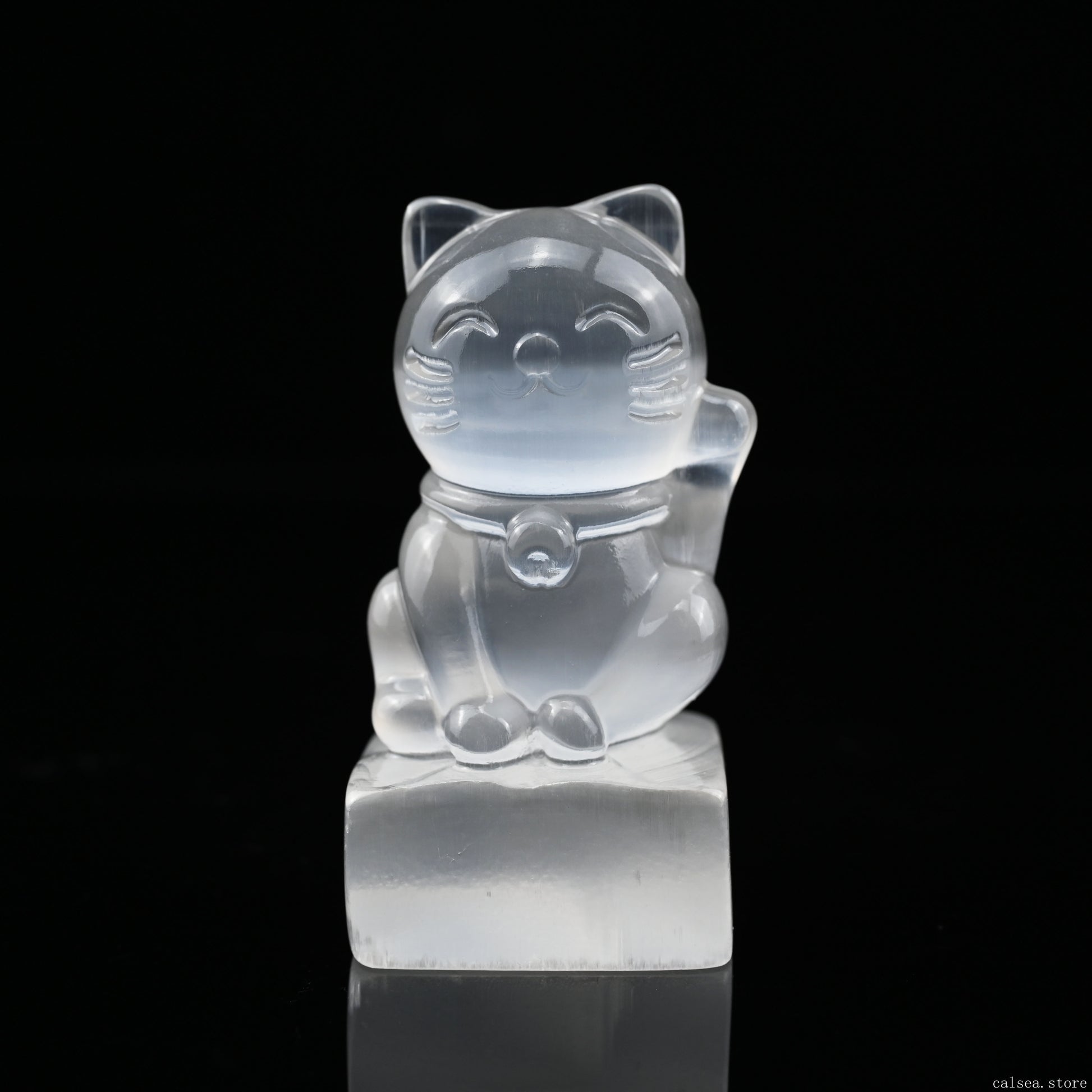 Selenite Lucky Cat Sculpture Crystal Healing Hand Carved